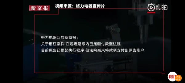 格力电器回应称,关于潜江案件,在规定期限内已足额付款至法院,目前原告已提起执行程序,但法院尚未将款项支付到原告账户;关于重庆案件,前期因快递单信息书写错误,判决书未能及时送达至格力电器(重庆)有限公司,目前双方已经达成执行和解。